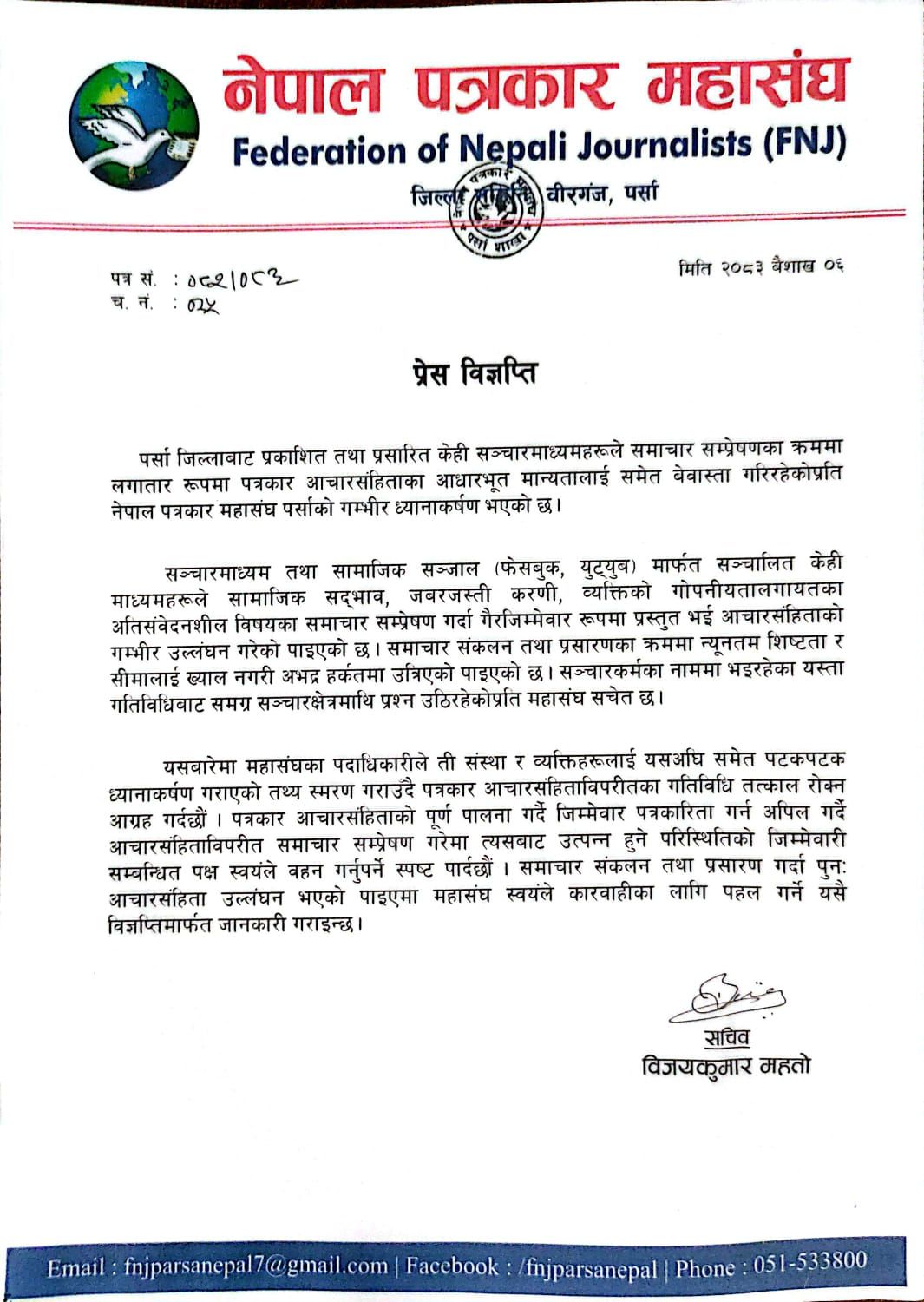 पर्सा जिल्लाबाट प्रकाशित तथा प्रसारित केही सञ्चारमाध्यम र केहि पत्रकारहरूले समाचार सम्प्रेषणका क्रममा लगातार रूपमा पत्रकार आचारसंहिताका आधारभूत मान्यतालाई समेत बेवास्ता गरिरहेकोप्रति गम्भीर ध्यानाकर्षण भएको नेपाल पत्रकार महासंघ पर्साले जनाएको छ ।