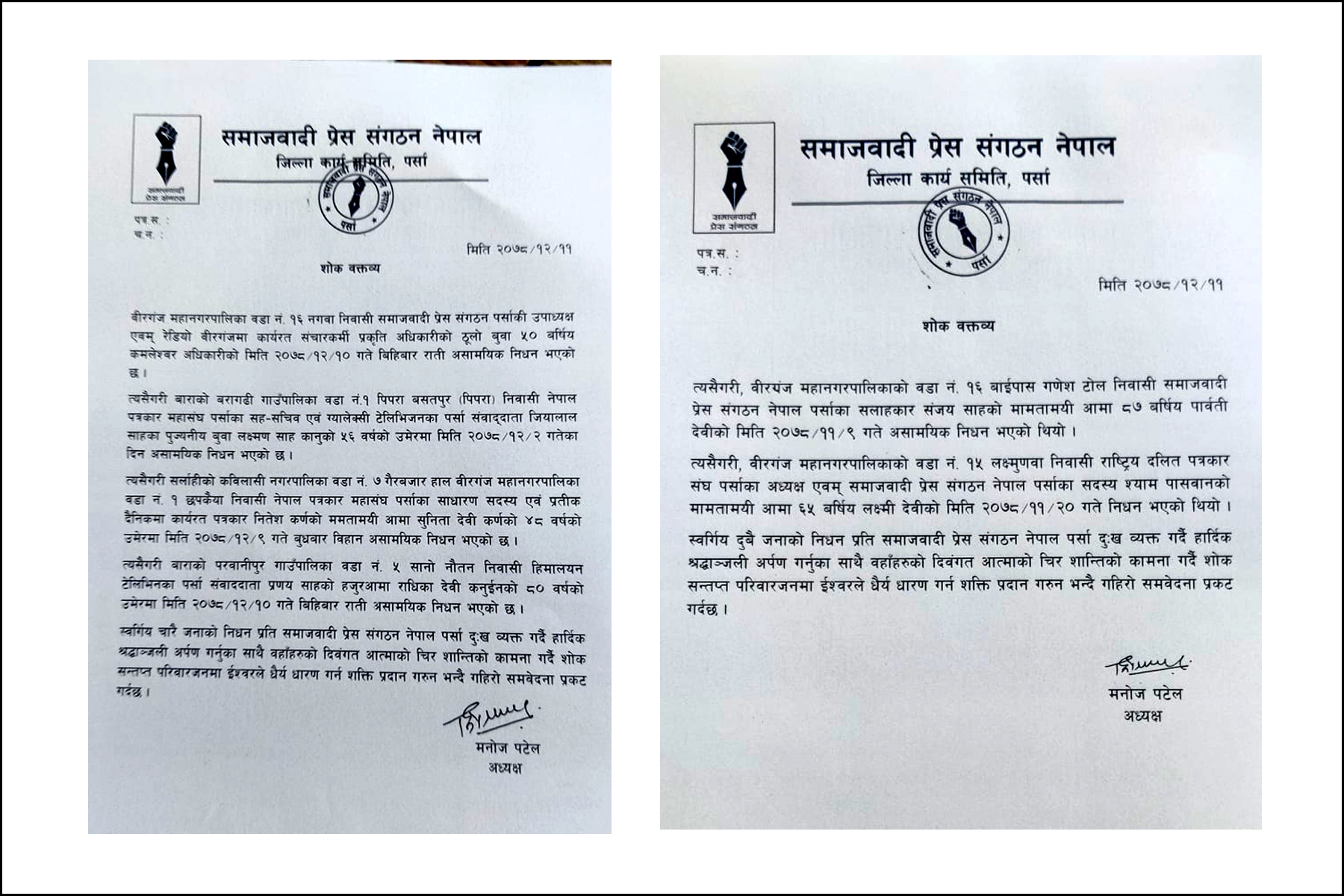 वीरगंज । वीरगंज महानगरपालिकाकाे वडा नं. १६ नगवा निवासी समाजवादी प्रेस संगठन पर्साकी उपाध्यक्ष प्रकृति अधिकारीको ठूलो बुवाकाे निधन भएकाे छ । रेडियो वीरगंजमा कार्यरत संचारकर्मी अधिकारीकाे ५० बर्षिय ठूलाे बुवा कमलेश्वर अधिकारीको बिहिबार राती असमायिक निधन भएकाे समाजवादी प्रेस सगठन पर्साले शाेक वक्तव्य जारी गर्दै जानकारी गराएकाे हाे । संगठन पर्साका अध्यक्ष मनाेज पटेलद्वारा हस्ताक्षरित शाेक वक्तव्य मार्फत स्वर्गिय बुवाकाे निधन प्रति दुःख व्यक्त गर्दै हार्दिक श्रद्धाञ्जली अर्पण गर्नुका साथै वहाँको दिवंगत आत्माको चिर शान्तिको कामना गर्दै शोक सन्तप्त परिवारजनमा ईश्वरले धैर्य धारण गर्न शक्ति प्रदान गरुन भन्दै गहिरो समवेदना प्रकट गरेका छन् । त्यसैगरी बाराको परवानीपुर गाउँपालिका वडा नं. ५ सानो नौतन निवासी हिमालयन टेलिभिनका पर्साका संवाददाता प्रणय साहको हजुरआमा ८० बर्षिय राधिका देवी कनुईनको चैत १० गते बिहिबार राती असामयिक निधन भएको संगठनले जनाएकाे छ । त्यसैगरी सर्लाहीको कविलासी नगरपालिका वडा नं. ७ गैरबजार हाल वीरगंज महानगरपालिका वडा नं. १ छपकैया निवासी नेपाल पत्रकार महासंघ पर्साका साधारण सदस्य एवं प्रतीक दैनिकमा कार्यरत पत्रकार नितेश कर्णको ४८ बर्षिय सुनिता देवी कर्णको चैत ९ गते बुधबार विहान निधन भएको संगठनले जनाएकाे छ । त्यसैगरी बाराको बरागढी गाउँपालिका वडा नं.१ पिपरा बसतपुर (पिपरा) निवासी नेपाल पत्रकार महासंघ पर्साका सह–सचिव एवं ग्यालेक्सी टेलिभिजनका पर्सा संवाददाता जियालाल साहका बुवा ५६ बर्षिय लक्ष्मण साह कानुको चैत २ गते असामयिक निधन भएको संगठनले जनाएकाे छ । त्यसैगरी, वीरगंज महानगरपालिकाको वडा नं. १६ बाईपास गणेश टोल निवासी समाजवादी प्रेस संगठन नेपाल पर्साका सलाहकार संजय साहको मामतामयी आमा ८७ बर्षिय पार्वती देवीको फागुन ९ गते निधन भएको थियो । त्यसैगरी, वीरगंज महानगरपालिकाको वडा नं. १५ लक्ष्मुणवा निवासी राष्ट्रिय दलित पत्रकार संघ पर्साका अध्यक्ष एवम् समाजवादी प्रेस संगठन नेपाल पर्साका सदस्य श्याम पासवानको मामतामयी आमा ६५ बर्षिय लक्ष्मी देवीको फागुन २० गते निधन भएको थियो । स्वर्गिय पांचै जनाकाे निधन प्रति समाजवादी प्रेस संगठन नेपाल पर्सा दुःख व्यक्त गर्दै हार्दिक श्रद्धाञ्जली अर्पण गर्नुका साथै वहाँहरुको दिवंगत आत्माको चिर शान्तिको कामना गर्दै शोक सन्तप्त परिवारजनमा ईश्वरले धैर्य धारण गर्न शक्ति प्रदान गरुन भन्दै गहिरो समवेदना प्रकट गरेकाे छ ।