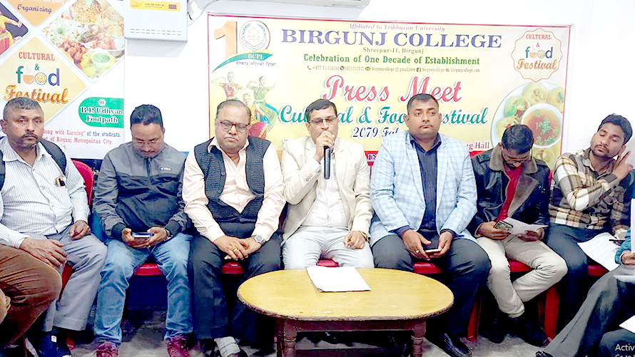 वीरगंज (पर्सा), ४ फागुन / वीरगंज कलेजले १० औं वार्षिकोत्सवको अवसरमा रात्रि सांस्कृतिक तथा खाना मेला आयोजना गर्ने भएको छ । कलेज प्राङ्गणमा आयोजित पत्रकार सम्मेलनमा यही फागुन १२ र १३ गते घण्टाघरदेखि उत्तरतर्फ बी.पी. उद्यान छेउको फुटपाथमा अपरान्ह ३ बजेदेखि राति १० बजेसम्म मेला लाग्ने कलेजका अध्यक्ष डा. दीपेन्द्र कुमार चौधरीले जानकारी दिए ।