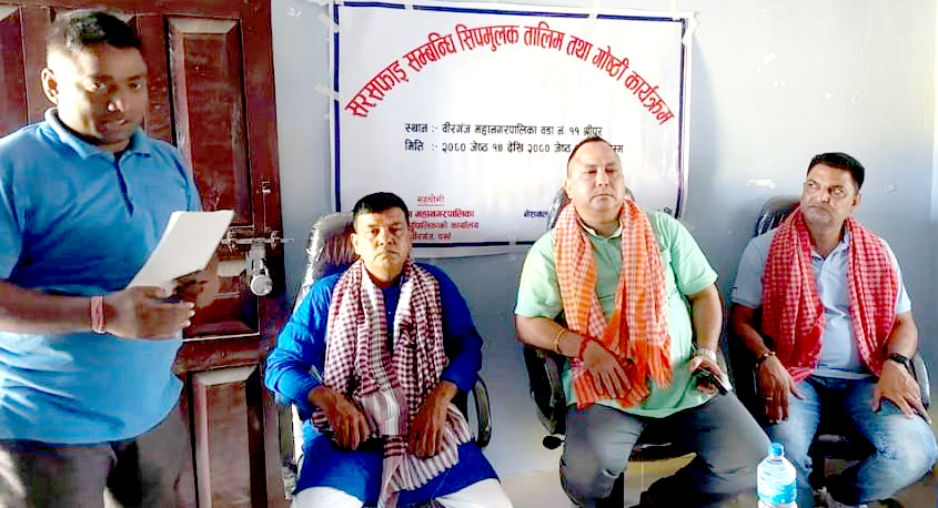 वीरगंज (पर्सा), १७ जेठ । वीरगंज महानगरस्तरीय सरसफाई सम्बन्धी सीपमुलक तालिम तथा गोष्ठी सुरु भएको छ । महानगरपालिकाको सहयोगमा नेशनल इम्प्लोयमेन्ट डेभलपमेन्ट सेन्टर प्रा.ली.ले आठ दिने तालिमको आयोजना गरेको हो । सरसफाई सम्बन्धी सचेतना फैलाउनुका साथै फोहोरको उचित व्यवस्थापन गरी फोहोरबाट मोहर बनाउने किसिमका सीप सिकाउने अभिप्रायका साथ तालिमको आयोजना गरिएको महानगर प्रमुख राजेशमान सिंहले बताए ।